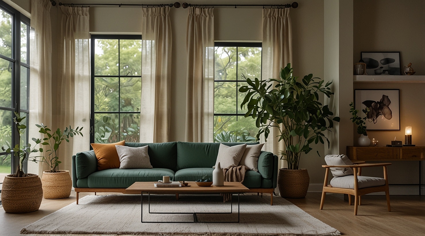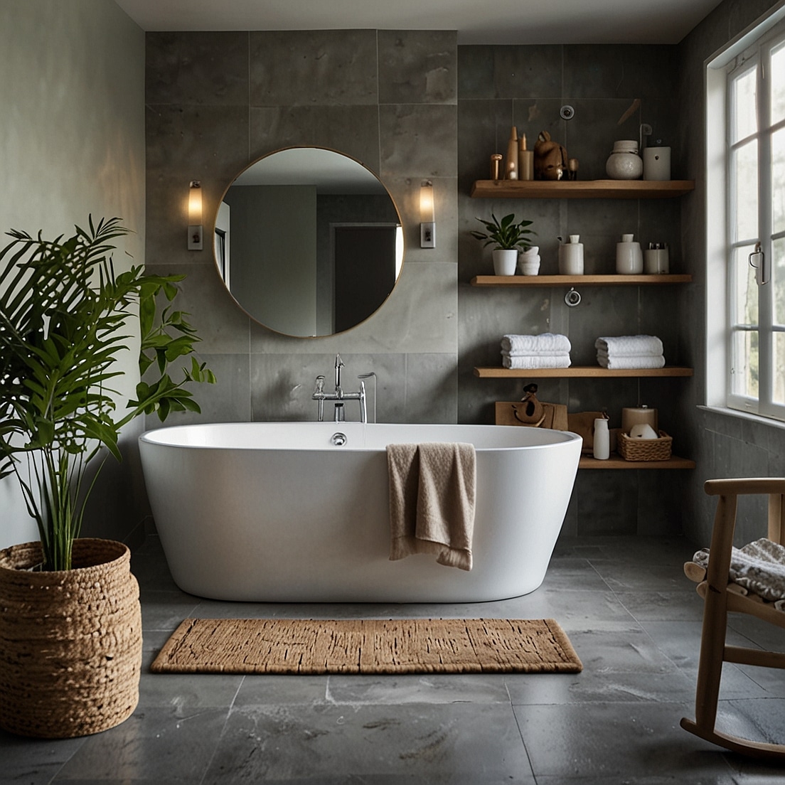 • Naturalne akcenty: Rośliny doniczkowe, kamienne dodatki.