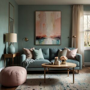 • Subtelne przejścia: Pastelowe odcienie miętowego i pudrowego różu nadają wnętrzu lekkości.