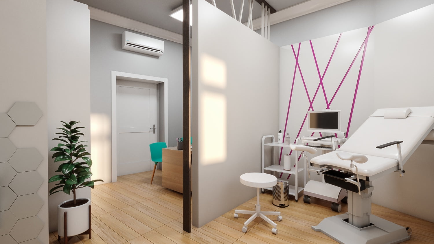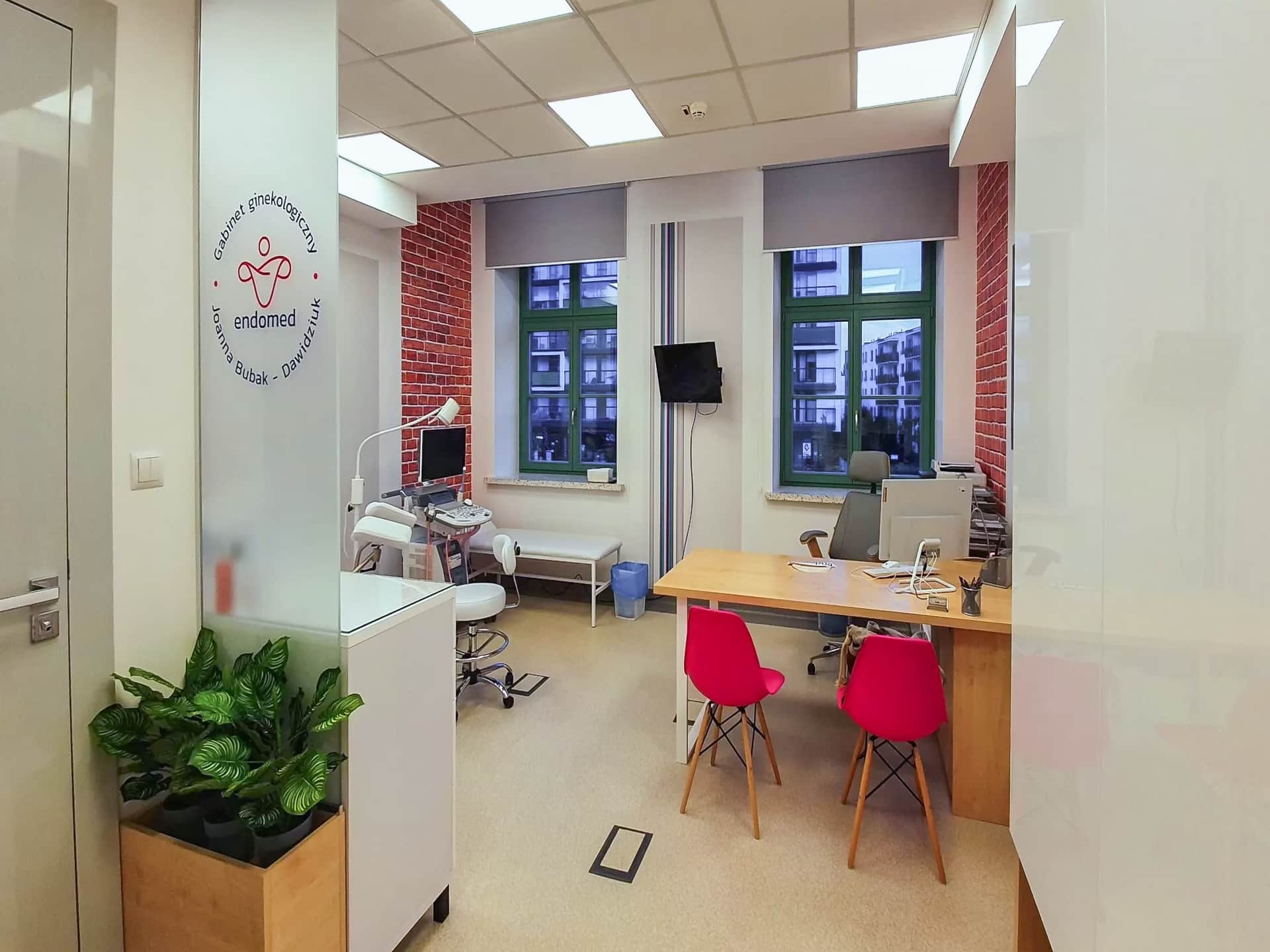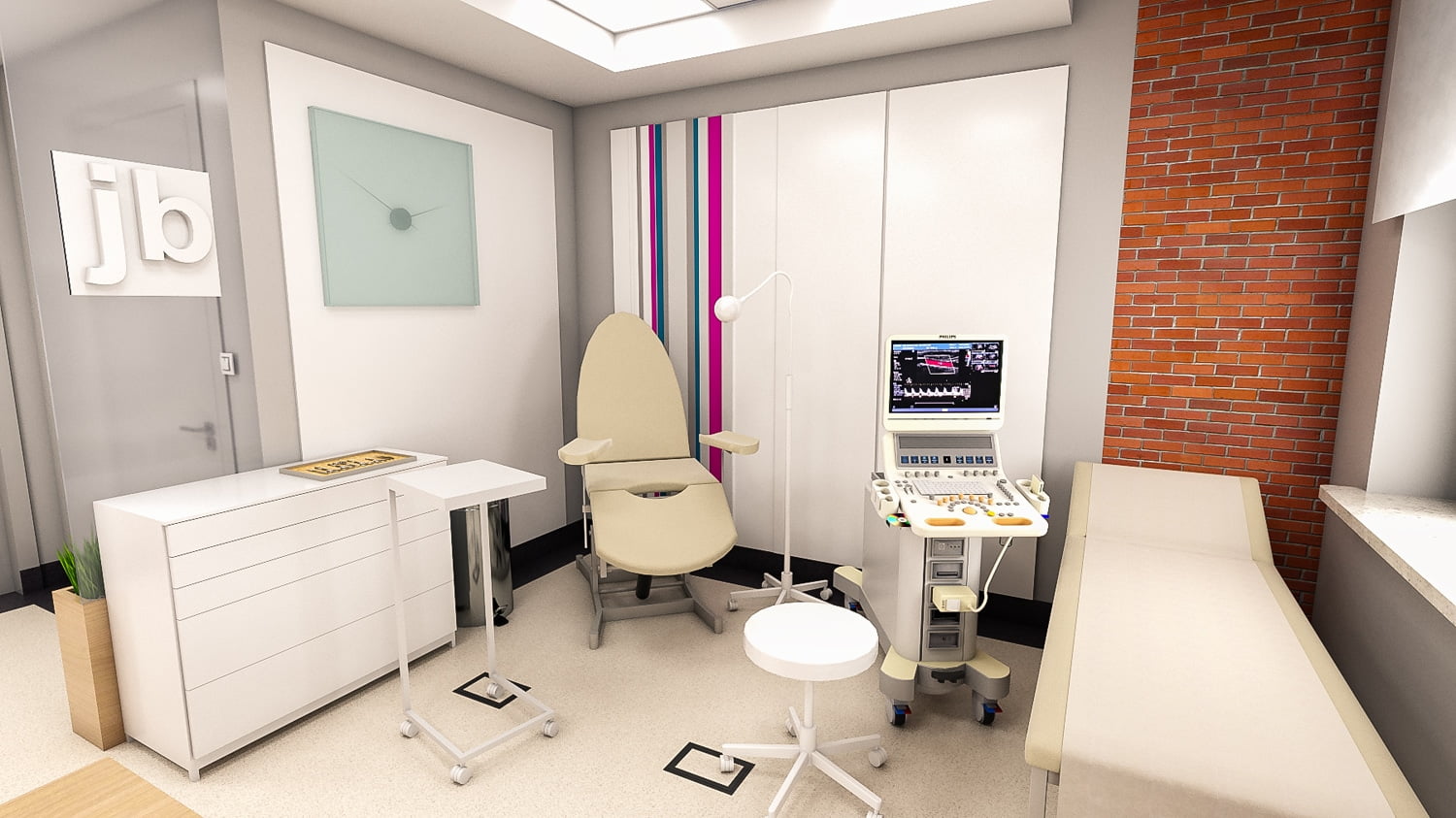 Projekt opracowany zdalnie w czasie pandemii. Priorytetem była intymność pacjentek, ergonomia procedur oraz dostęp do instalacji i mediów w naturalnym zasięgu pracy zespołu.