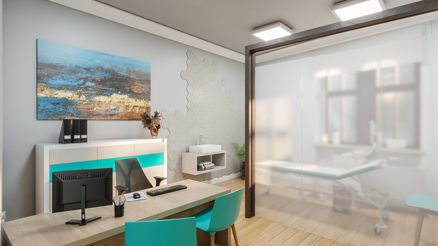 Nowoczesny gabinet medyczny — ergonomiczny układ stanowisk i czytelne ciągi