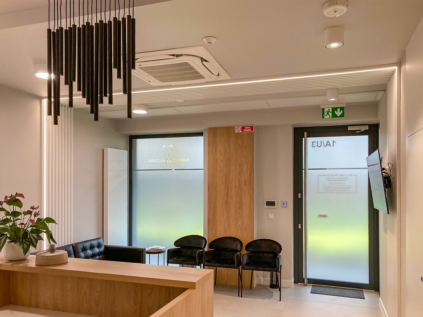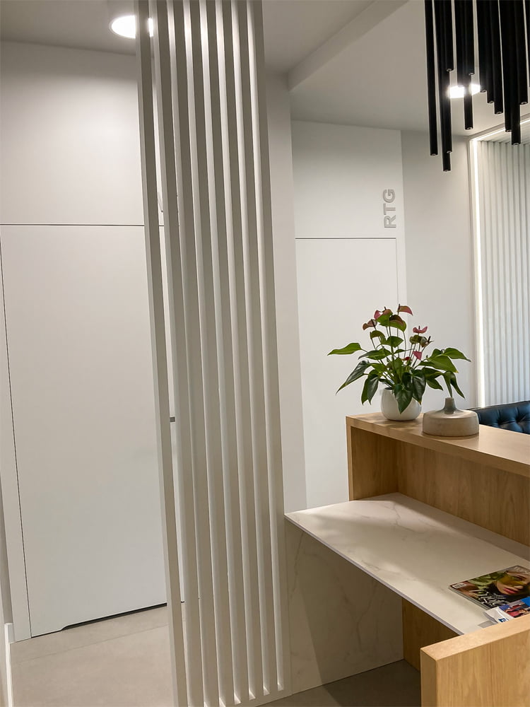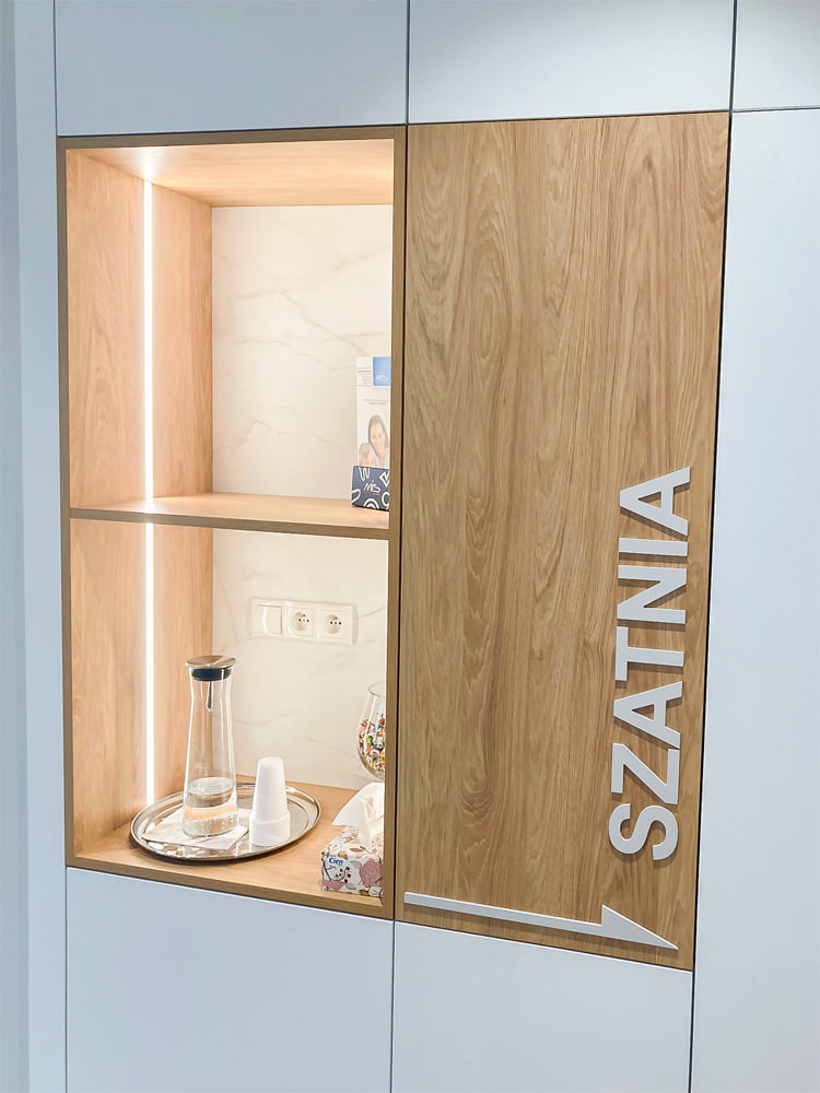 Design wspierający markę: Estetyka gabinetu powinna odzwierciedlać wartości i filozofię marki, tworząc spójny i rozpoznawalny wizerunek. Spójny wizerunek dotyczy nie tylko materiałów ale także kolorystyki oraz grafiki nawiązujących do logo, tablic informacyjnych I reklamowych.